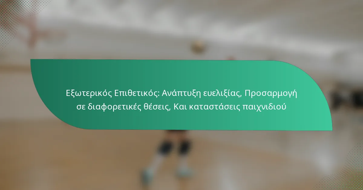 Ο εξωτερικός επιθετικός είναι ένας ζωτικός παίκτης στο βόλεϊ, υπεύθυνος για τις επιθετικές και αμυντικές ενέργειες. Η ανάπτυξη ευελιξίας σε αυτή τη θέση είναι απαραίτητη, καθώς επιτρέπει στους παίκτες να προσαρμόζονται σε διαφορετικούς ρόλους και καταστάσεις παιχνιδιού, ενισχύοντας τη συνολική τους συμβολή στην επιτυχία της ομάδας.